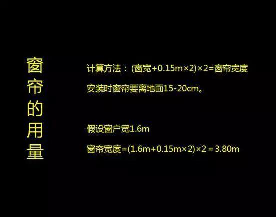 注:普通窗簾多為平開簾,首先根據窗戶的規格來確定窗簾的大小,其次窗簾要蓋住窗框左右各0.15m,并且打兩倍褶。